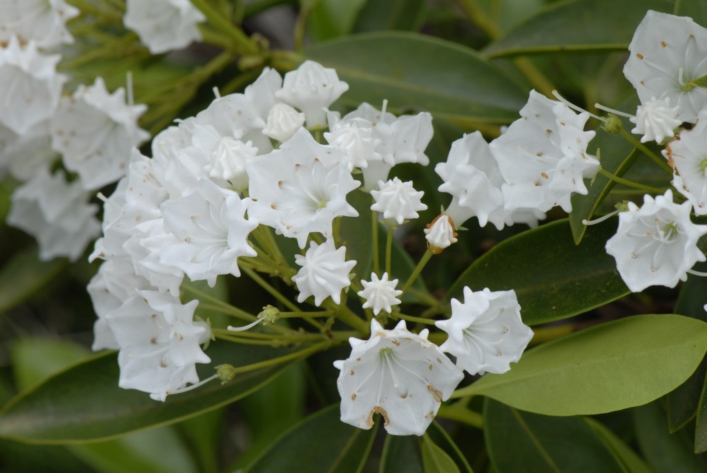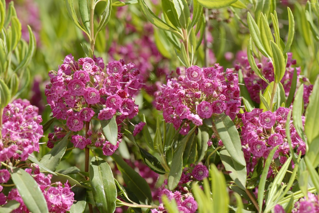 - Kalmia latifolia L., l’espèce la plus connue et la plus ornementale, est appelée « laurier des montagnes ». Son habitat s’étend du Maine à l’Alabama, sous des conditions climatiques très différentes. De ce fait, les plantes du Sud ne s’acclimatent pas au Nord, ce qui lui a valu une fausse réputation de faible rusticité. C’est un grand arbuste qui peut atteindre 4 m de haut. Certains spécimens âgés, notamment en Caroline du Sud, forment de petits arbres. En juin, la floraison mélange des corolles ouvertes roses pâle, en forme de soucoupes, et des fleurs encore fermées, au revers des pétales plus foncé, constituant un décor spectaculaire.