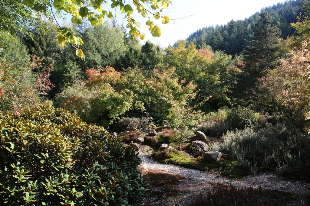 1. A l’Est, le long du sentier botanique sont rassemblées et étiquetées la majeure partie des espèces botaniques d’Ericacées. Pour reconstituer un couvert forestier, diverses essences américaines et asiatiques ont été plantées, notamment des pins et des chênes d’Amérique du Nord, des magnolias et érables asiatiques et des cryptomerias du Japon. La présence de mousse (polytrichum) et de pierres, ainsi que d’érables japonais donnent une ambiance particulière à cette partie.