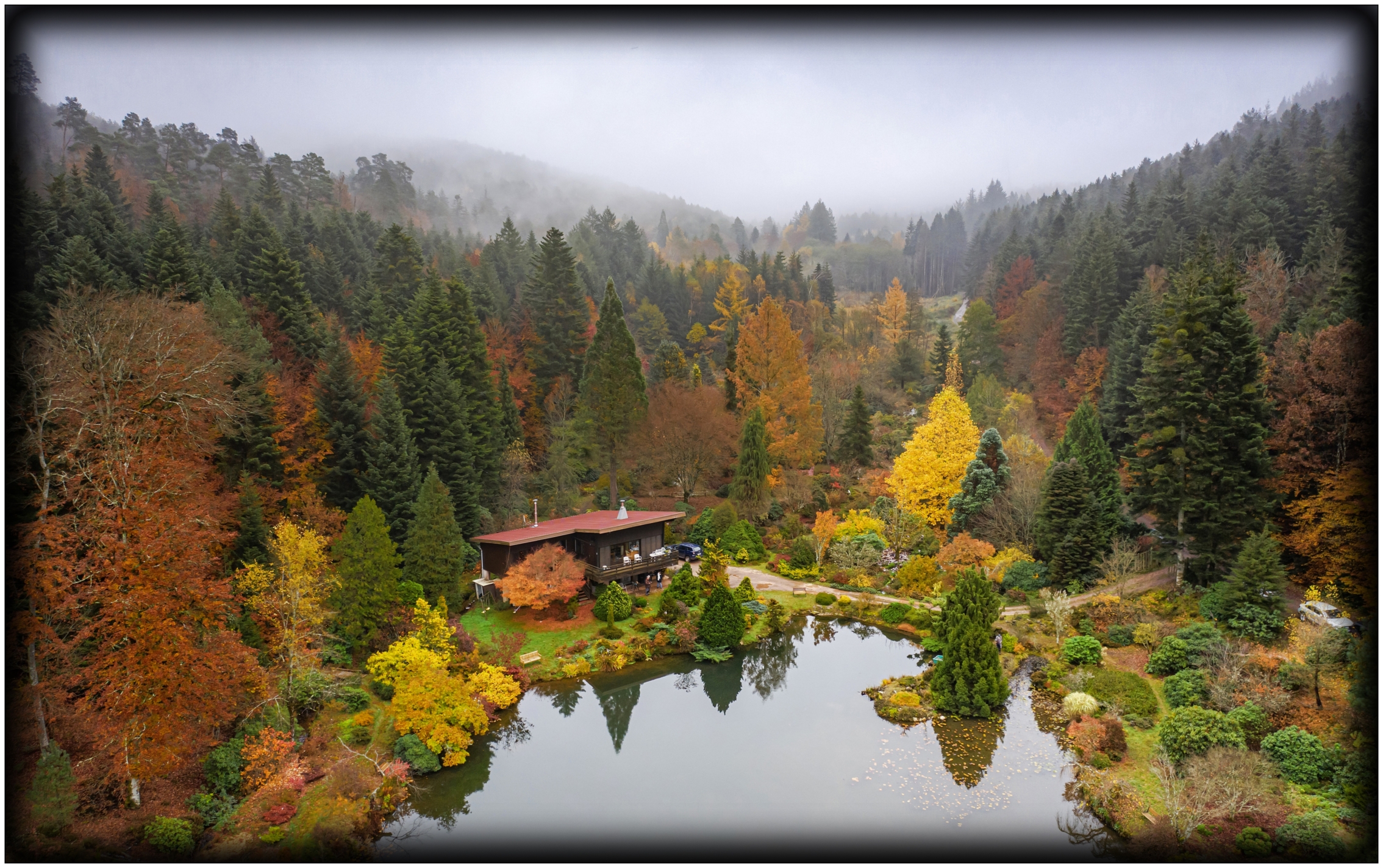 2. A l’Ouest, autour de l’étang, l’aspect paysager est dominant avec, sur un arrière-plan forestier, une recherche particulière d’associations de formes et de couleurs entre les rhododendrons et azalées hybrides et de nombreux autres arbustes et plantes vivaces.