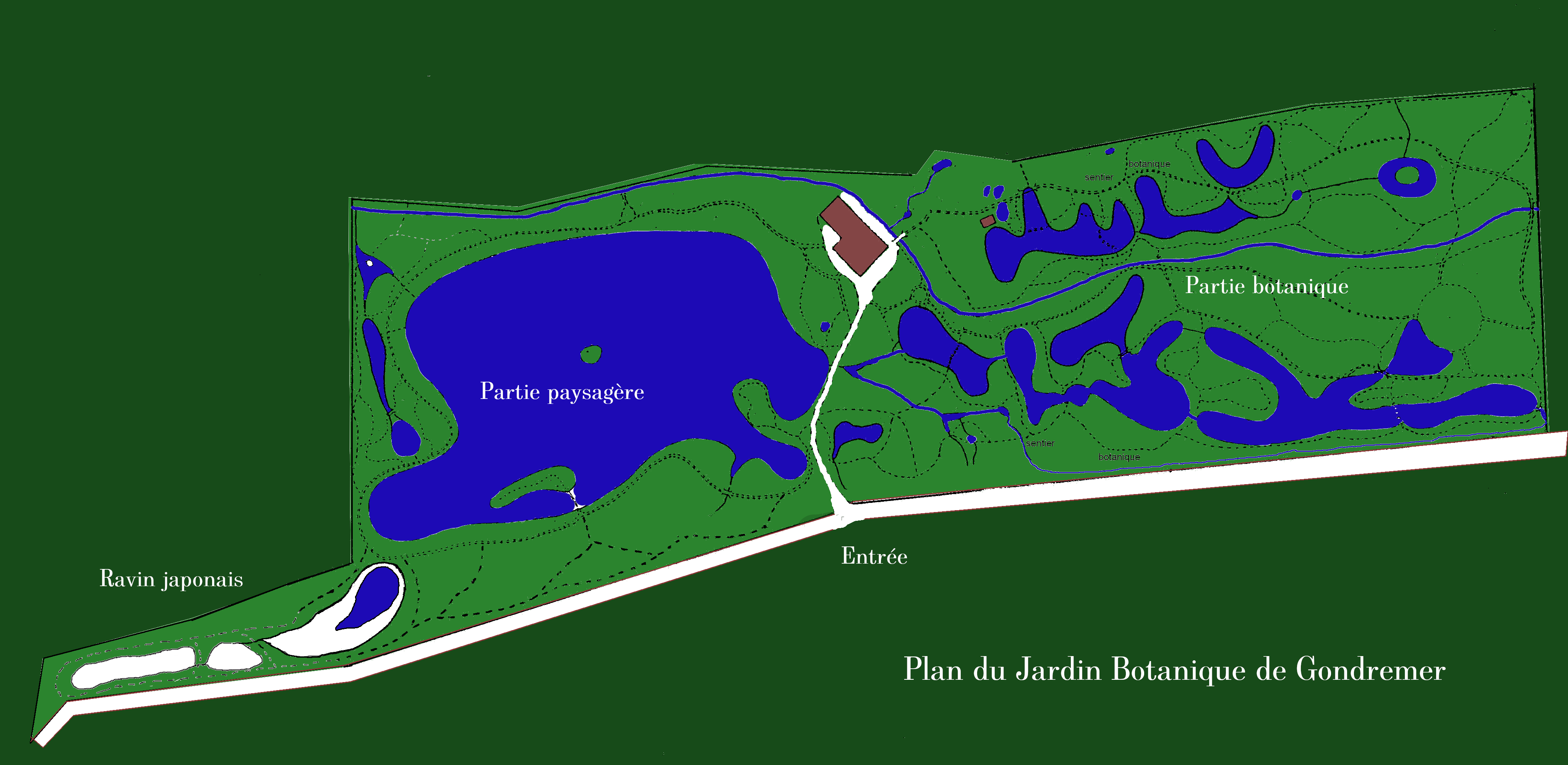 L’espace du jardin est divisé en trois parties : une partie botanique à l’est, une partie paysagère à l’ouest et une partie nommée « ravin japonais ».